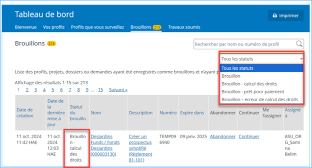 À l’onglet « Brouillons », tous les utilisateurs d’une organisation qui ont les mêmes autorisations liées aux catégories de dossiers peuvent consulter, continuer et soumettre un brouillon (profils et dossiers).