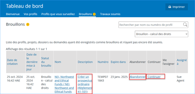 Sue a aussi l’autorité sur les dépôts de placements de titres. Elle peut consulter le dossier dans son menu « Brouillons » et sélectionner « Me l’assigner » pour le continuer et le soumettre. En utilisant la fonction « Me l’assigner », Sue devient la personne-ressource principale associée à ce dossier.