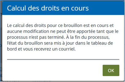 Pendant le calcul des droits, vous ne pouvez pas modifier le brouillon. Si vous cliquez sur l’un des liens encadrés ci-dessous, un message d’avertissement s’affichera.