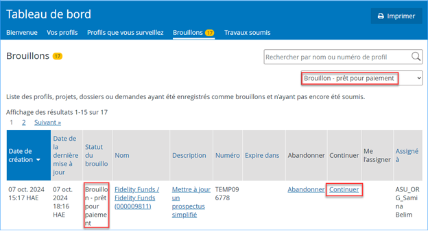 Vous recevez un courriel vous indiquant que le calcul des droits est terminé. L’état du brouillon est maintenant « Brouillon – prêt pour paiement ». Cliquez sur « Continuer » dans la ligne correspondant au brouillon pour vous rendre à la page de sommaire des droits et soumettre le dossier.