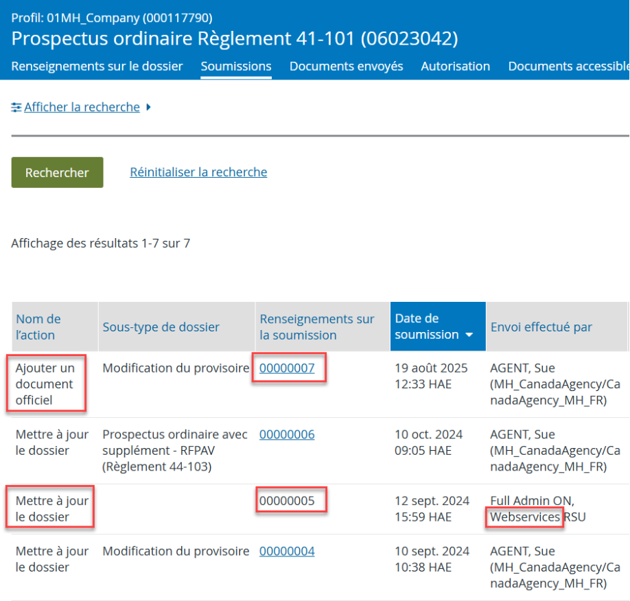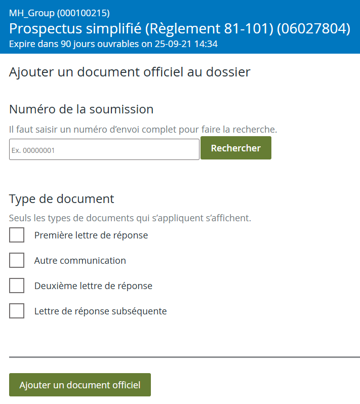 Remarque : vous trouverez le numéro de soumission dans l’onglet « Soumission » du dossier. La recherche pour « Ajouter un document officiel » ne peut être utilisée que pour les soumissions de type création ou mise à jour d’un dossier. La recherche ne fonctionne pas pour les soumissions « Ajouter un document officiel » ou des soumissions de mises à jour à partir du service Web d’une autorité.