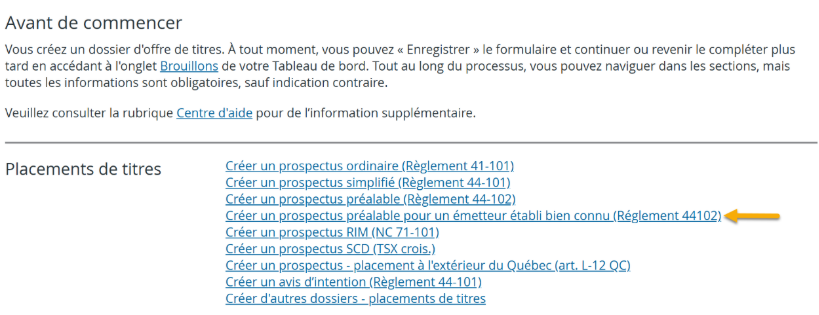 Le prospectus et les documents justificatifs doivent être déposés au moyen du type de dossier « Prospectus préalable pour un émetteur établi bien connu (Règlement 44-102) » :